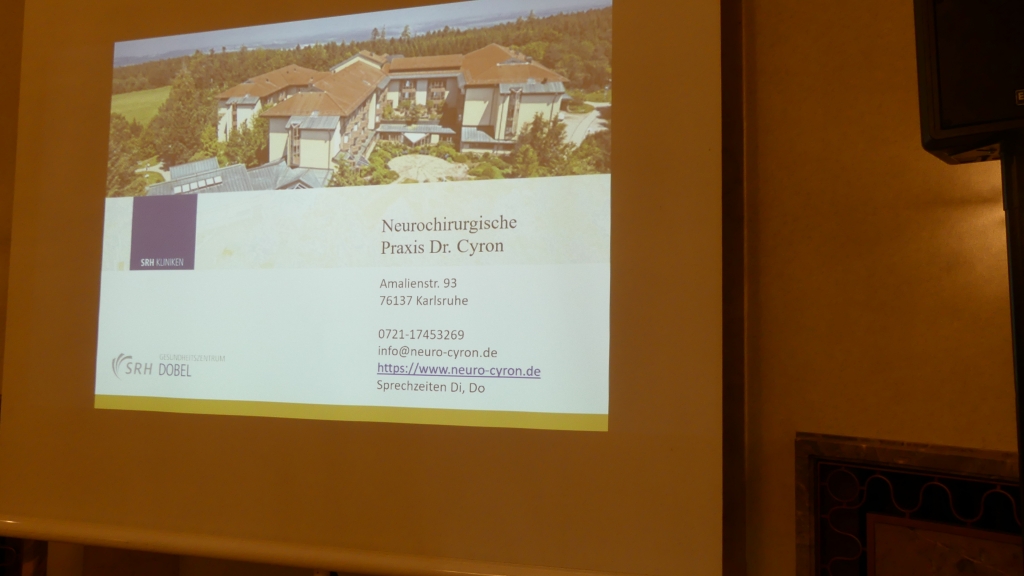 Den Anfang machte Herr Dr. med. Donatus Cyron, der als Oberarzt in der SRH – Klinik Waldbronn und in seiner Praxis in Karlsruhe für die Feinjustierung der Implantate von Patienten mit einer THS (Tiefe Hirnstimulation) zuständig ist. Er erklärte, welche Zielpunkte im Gehirn angesteuert werden und beleuchtete die physischen und psychischen Auswirkungen (auch die Nebenwirkungen) der THS. Außerdem stellte er im Schnelldurchlauf die SRH – Klinik und seine Praxis vor. Das Referat von Dr. Cyron können Sie hier nachlesen: Dr. Cyron © (bitte anklicken)